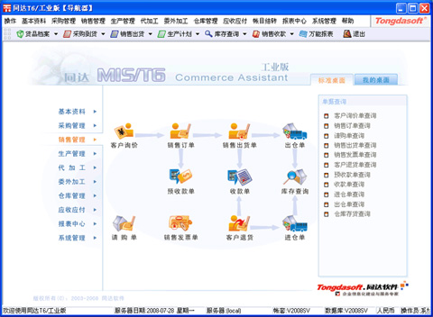 同达软件公司针对以上具体情况,研发了T6工业版软件,此产品功能涵盖了中小型工厂的主要业务, 如:采购管理、生产管理、外协管理、代加工管理、销售管理、仓库管理、应收应付管理等,能够满足大部份中小型工厂的需求。 另外其价格相对较便宜,使工厂无需花费大额资金购买一些不适用的功能。当然,随着工厂规模的扩大与信息化管理需求的增加, 用户可以很方便的升级到更高级的版本或是ERP系统,免去了工厂发展后信息化管理水平跟不上的顾虑。