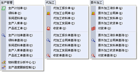 T6工业版涵盖了工厂生产相关的所有业务。生产管理从生产计划到车间领料再到生产完工入库管理产品的整个生产过程, 另外还可以管理到车间多余原料的退回仓库及不合格产品的返工;代加工管理帮助工厂管理客户来工厂加工的业务, 从代加工的报价、代加工合同的签订、代加工收料、生产完成后发回产品以及收取代加工费;委外加工管理帮助工厂管理需要其他加工厂加工的业务, 从委外加工询价、委外加工合同的签订、委外加工发料到代加工厂、委外加工收货以及付加工费用。
